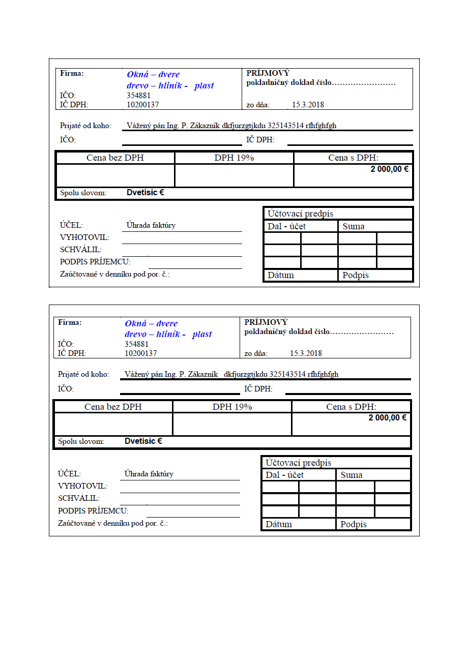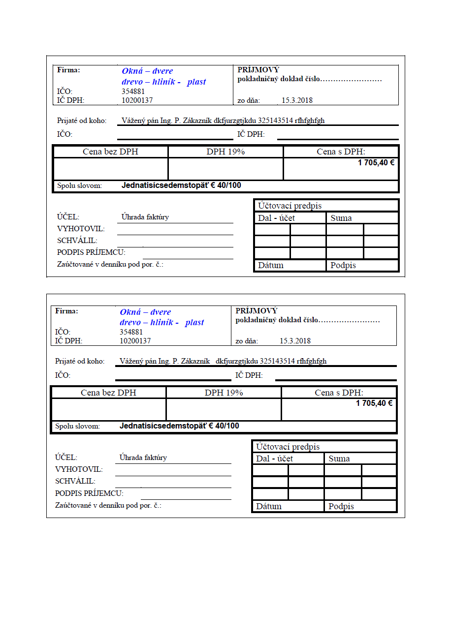 Príjmový doklad na zálohu