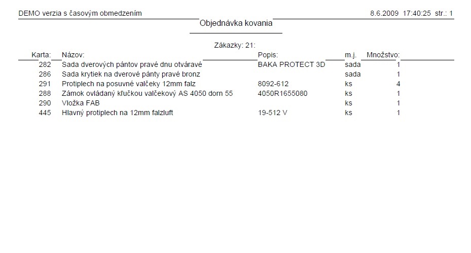 Objednávka kovania podľa dielov
