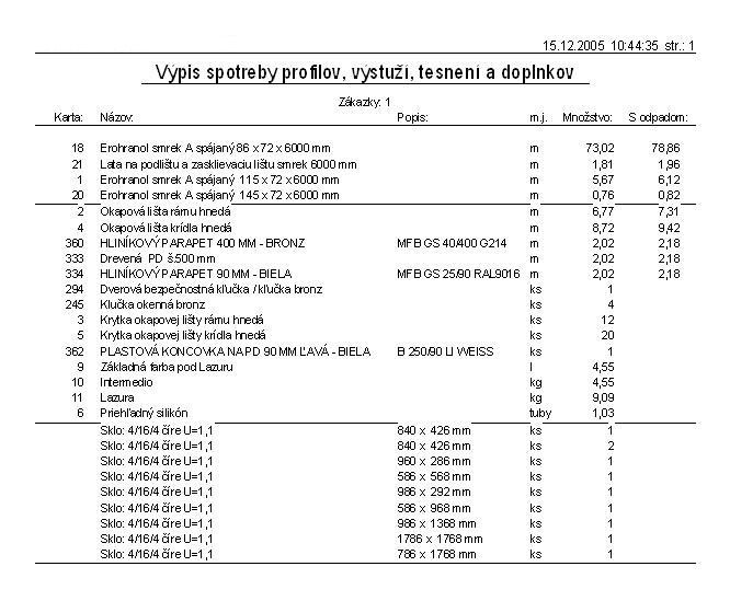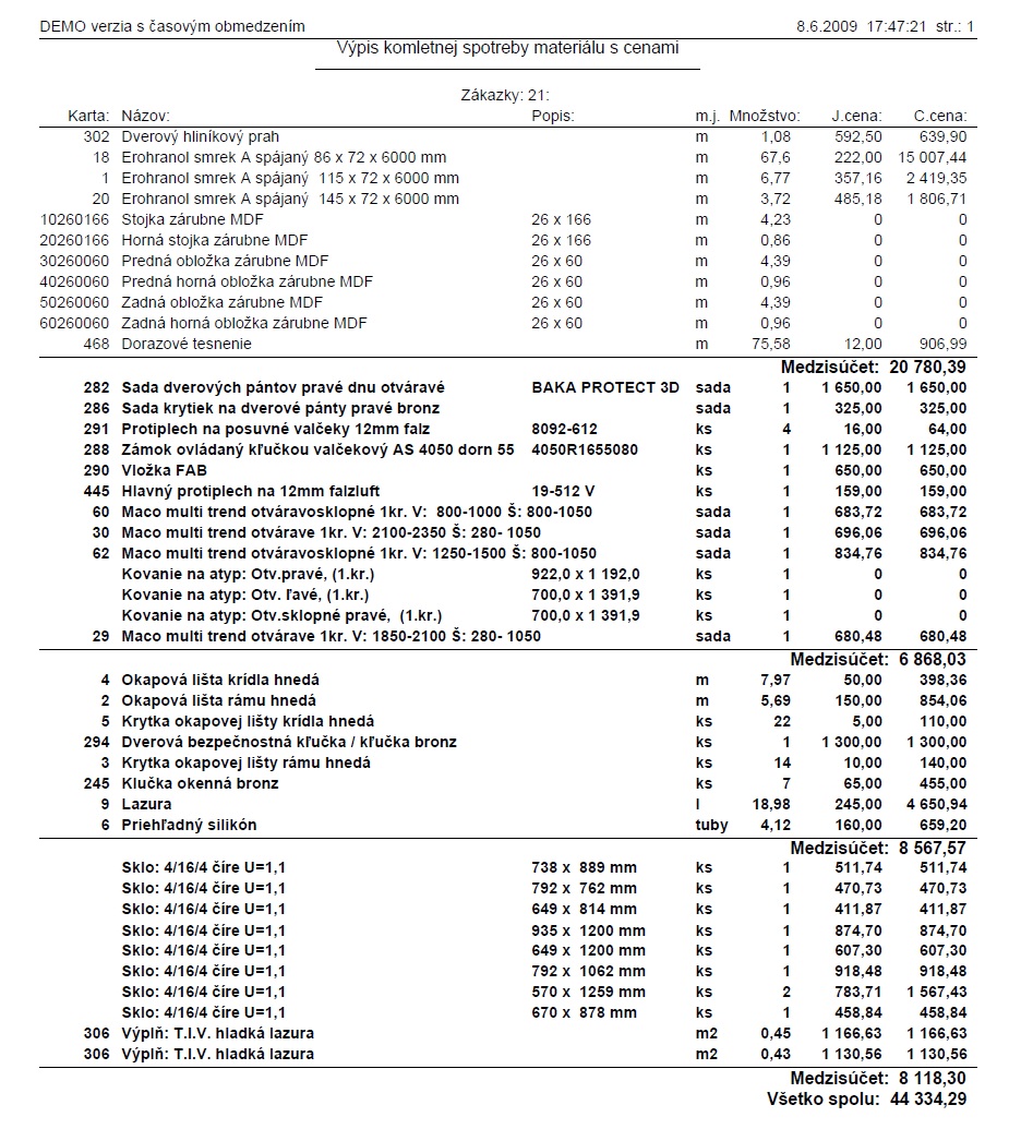 Spotreba materiálu s cenami
